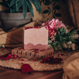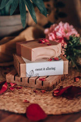The product: A gentle cleansing soap formulated for face, hands and body. The addition of French pink clay and Australian red clay makes it particularly well suited for sensitive skin, and gives it a lovely pink hue. The fragrance is floral and sweet, like a garden in summer. There are small variations between the design of each bar (see photos).